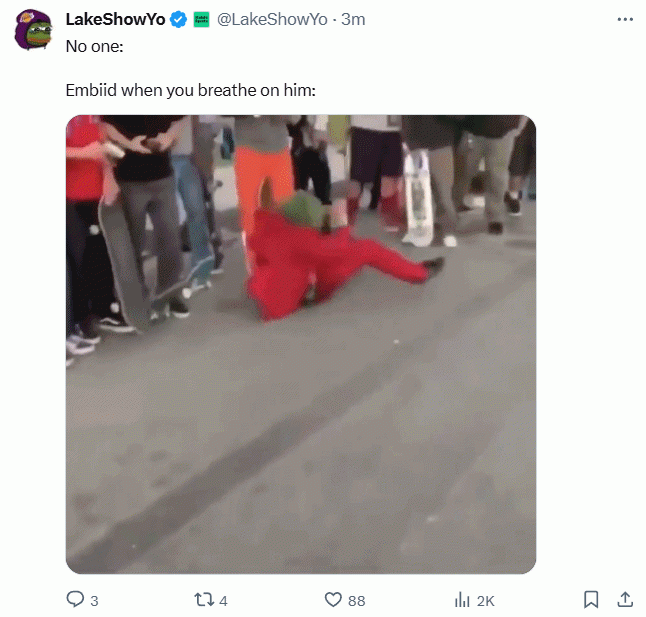 湖人自媒体嘲讽恩比德假摔:当你对着恩比德呼气时 他会这样