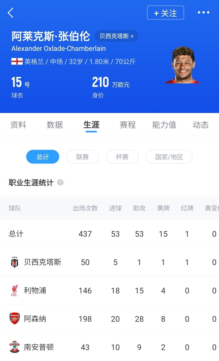 32岁的张伯伦生涯曾效力南安普顿、阿森纳、利物浦和贝西克塔斯,去年夏窗张伯伦与贝西克塔斯解约,近日他一直在阿森纳训练基地保持状态,目前球员德转身价210万欧。