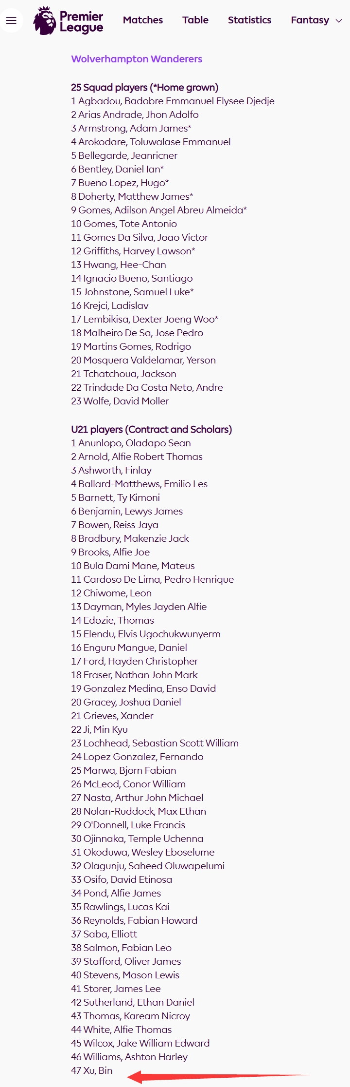 加油!英超官网冬窗更新名单:徐彬的名字出现在狼队U21球员一列