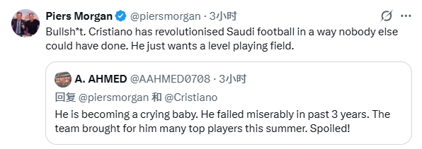 摩根爆粗回应:Bullsh*t,C罗彻底改变了沙特足球这是其他人做不到的,他只是想要公平的竞争环境。
