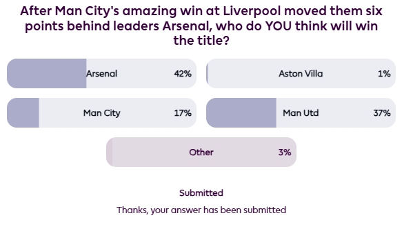 截至目前,阿森纳得票率最高,42%。此时排名英超第4的曼联得票率第2,37%。曼城得票率17%,维拉1%,其他球队3%。
