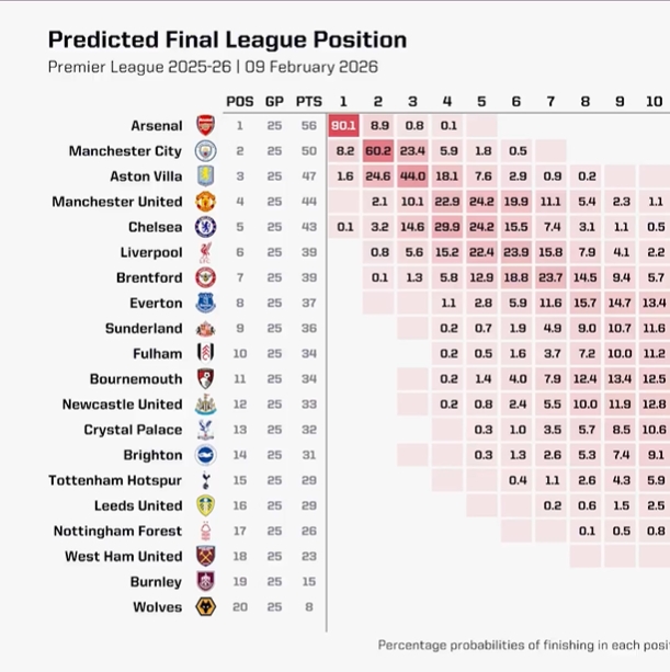 零点吧足球02月09日讯 英超第25轮结束,阿森纳6分领跑积分榜,曼城、维拉分列二三。opta也更新了英超夺冠概率,其中阿森纳高达90.1%,曼城8.2%,维拉1.6%,切尔西0.1%,利物浦和曼联则是0%。