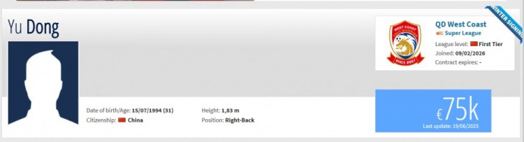 零点吧足球2月9日讯 德国转会市场网站显示,此前效力浙江队的边后卫董宇已经加盟青岛西海岸。