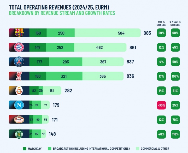 8大联赛24/25赛季冠军营收:巴萨9.85亿欧第1 拜仁连续33财年盈利
