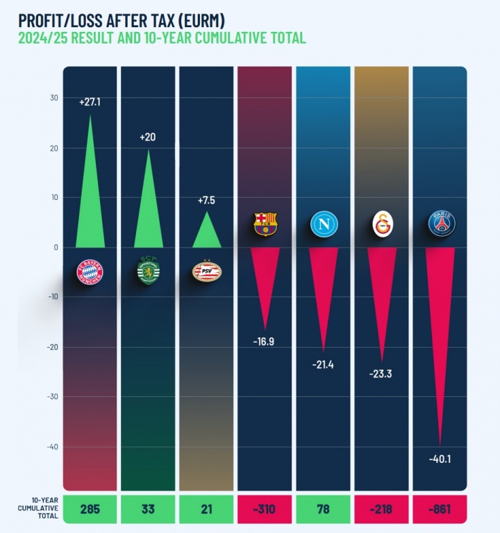 拜仁慕尼黑净利润最高(2700万欧元),延续了连续33个财年盈利的空前纪录,并在过去十年累计实现净利润2.85亿欧元。葡萄牙体育(2000万欧元)和埃因霍温(750万欧元)是另外两家保持盈利的冠军俱乐部。其他俱乐部则持续亏损,尽管部分已显现放缓迹象。巴黎圣日耳曼录得最高净亏损(4000万欧元),但已显着改善,其2021/22、2022/23和2023/24赛季的净亏损分别为3.69亿、1.1亿和6000万欧元。