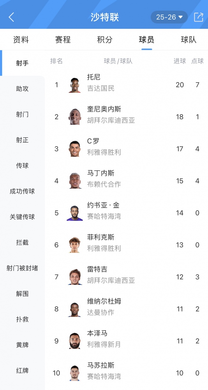 积分榜方面,利雅得胜利目前少赛1场排在沙特联第三。
