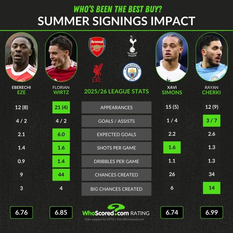 零点吧足球2月14日讯 whoscored对比了英超四大豪门在去年夏天的攻击型中场引援,维尔茨和谢尔基表现更好。
