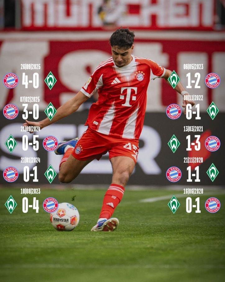 零点吧足球2月14日讯 本轮德甲拜仁对阵不莱梅的比赛即将打响,拜仁官推也晒出两队近10次交锋战绩。