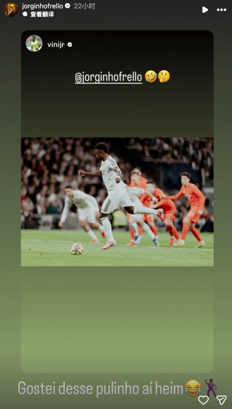 赛后,维尼修斯在社交媒体上晒出罚点照片,并@若日尼奥,附上笑哭??的表情符号。