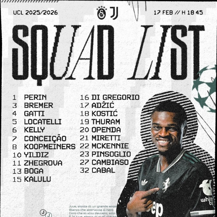 零点吧足球2月16日讯 北京时间12月18日凌晨,尤文将在欧冠附加赛首回合比赛中客场对阵加拉塔萨雷,尤文公布了此役的球员名单。K·图拉姆回归,霍尔姆、戴维缺席。