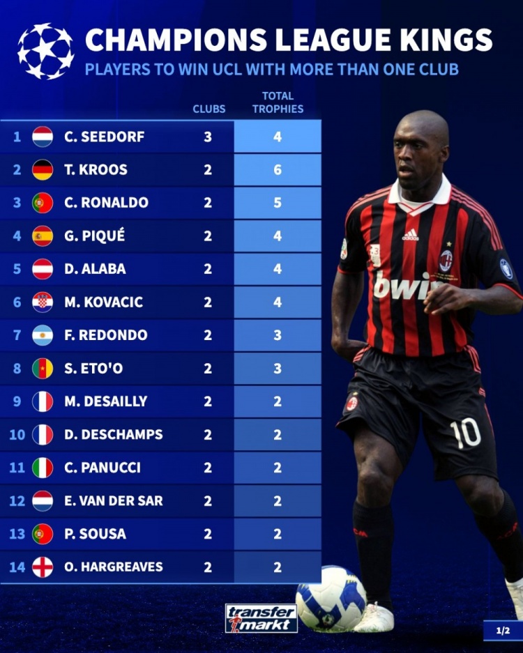 零点吧足球2月16日讯 《转会市场》统计了能够随不同球队赢得欧冠的球员,西多夫是唯一随3支不同球队夺得欧冠的球员。
