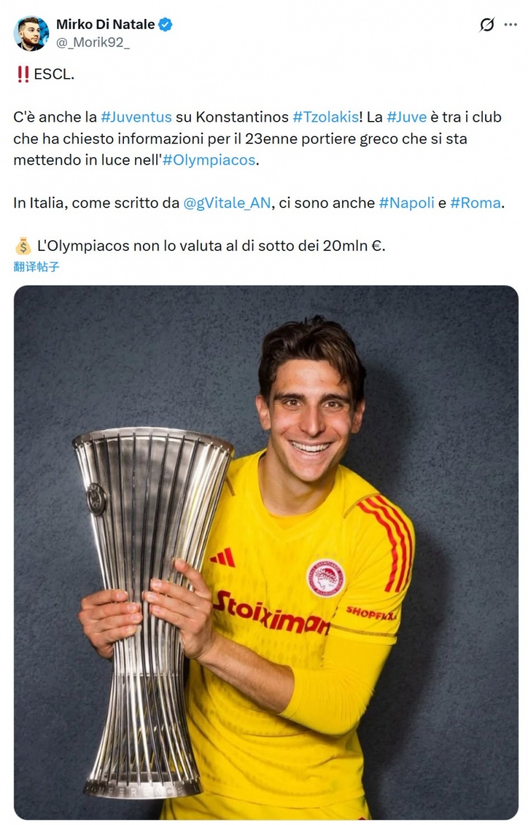 Mirko Di Natale透露,尤文也奥林匹亚科斯23岁门将佐拉基斯感兴趣,斑马军团是众多询问球员情况的俱乐部之一。除了尤文,那不勒斯、罗马也有意佐拉基斯,奥林匹亚科斯对其估价不低于2000万欧元。