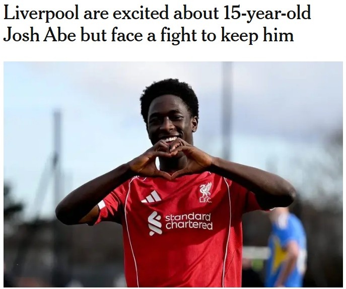 TA:利物浦想留住15岁青训天才乔希·阿贝,多家英超球队密切关注