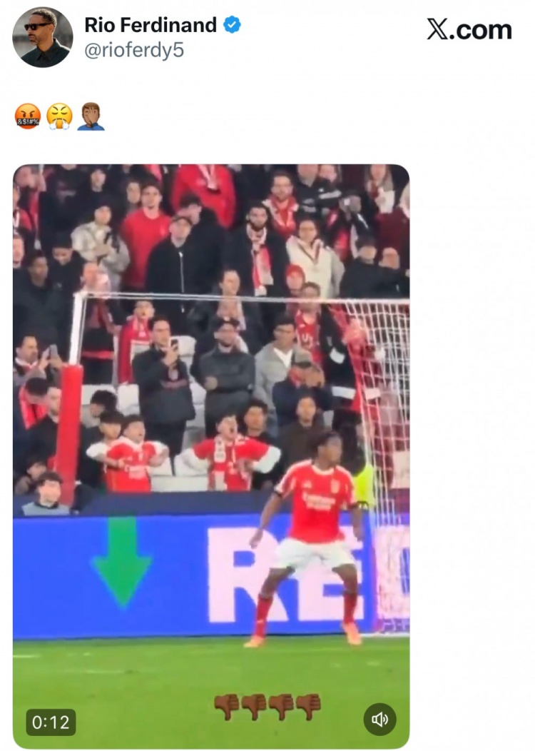 今日英超名宿费迪南德在社媒转发了一则视频,视频里两名本菲卡小球迷正做着种族歧视动作。费迪南德在社媒发emoji评论道:“?????????♂?”。
