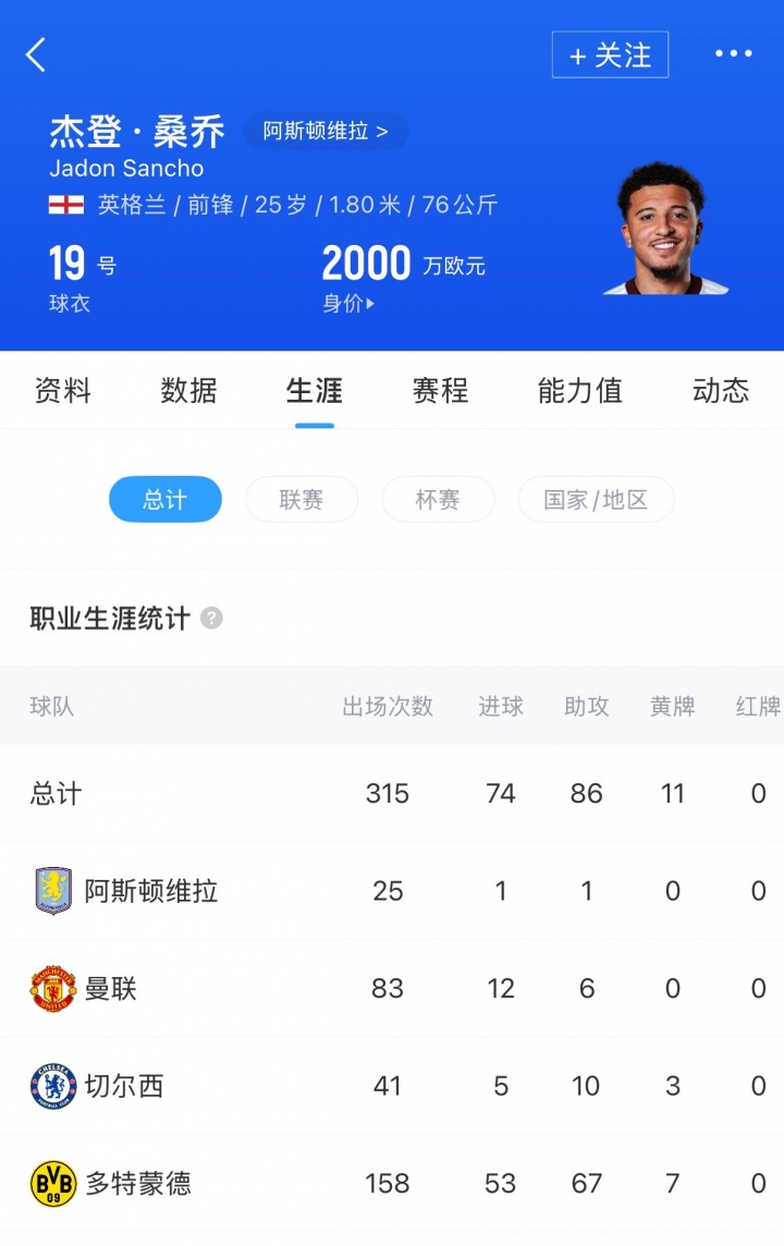 而桑乔本赛季在维拉表现依然低迷,他在赛季结束后预计还将寻找新东家。在2021年,曼联花费8500万欧元将桑乔从多特签下,目前球员身价仅剩2000万欧元。