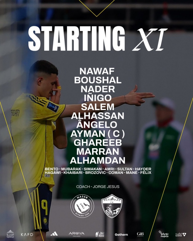 利雅得胜利替补:24-本托、61-穆巴拉克·布埃纳因、3-西马坎、5-阿姆里、2-苏丹·哈纳姆、8-海德尔、60-哈卡维、17-阿卜杜拉·哈巴利、11-布罗佐维奇、21-科曼、10-马内、79-菲利克斯