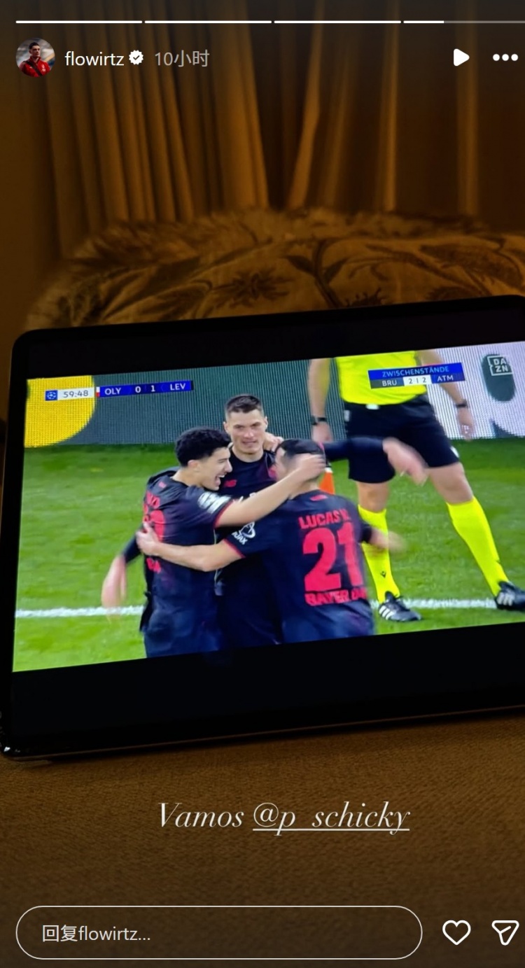利物浦球员维尔茨关注老东家勒沃库森的比赛,他在社交媒体上晒出用平板电脑观赛的照片,配文:“加油。”并@希克(此役梅开二度)。
