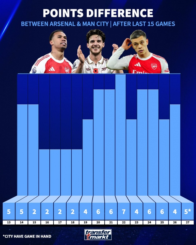 零点吧足球2月19日讯 英超第31轮比赛,阿森纳客场2-2战平狼队。德国转会市场列出表格,盘点了近15场英超比赛阿森纳与曼城的积分差距,阿森纳最多领先7分,而目前多赛1场领先5分。