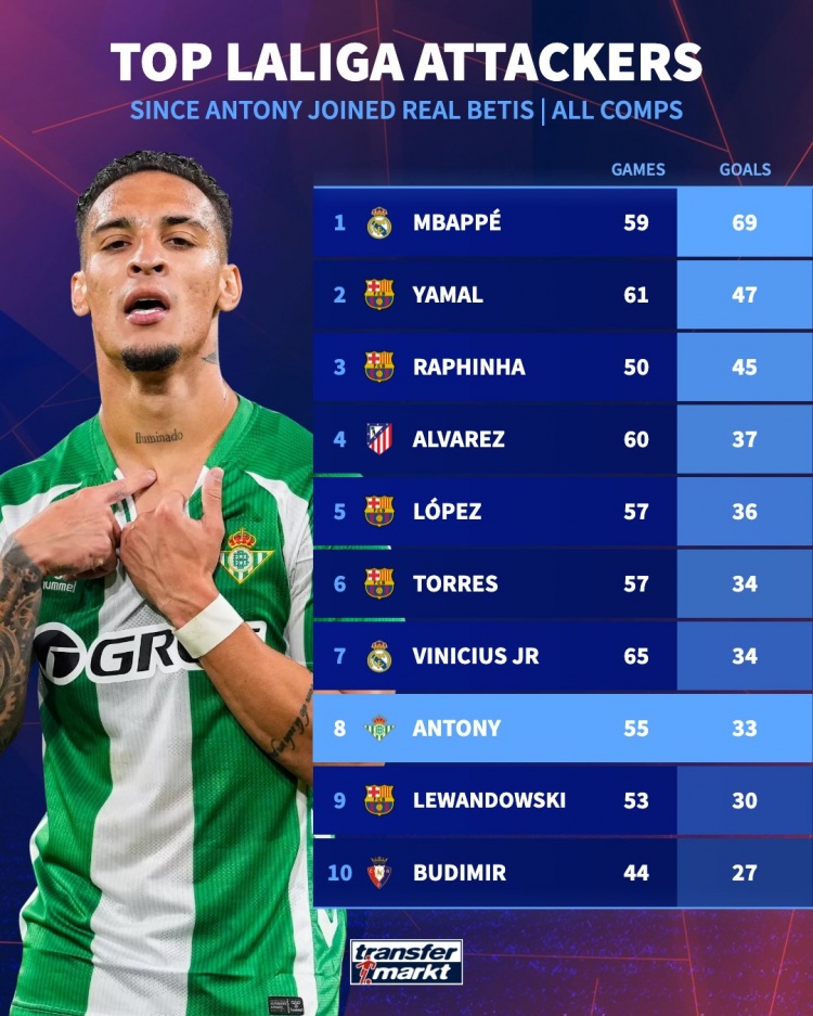在曼联经历低谷之后,安东尼在贝蒂斯重振了自己的职业生涯。本赛季到目前为止,他各项赛事代表贝蒂斯出战29场比赛,打进10球送出9次助攻。