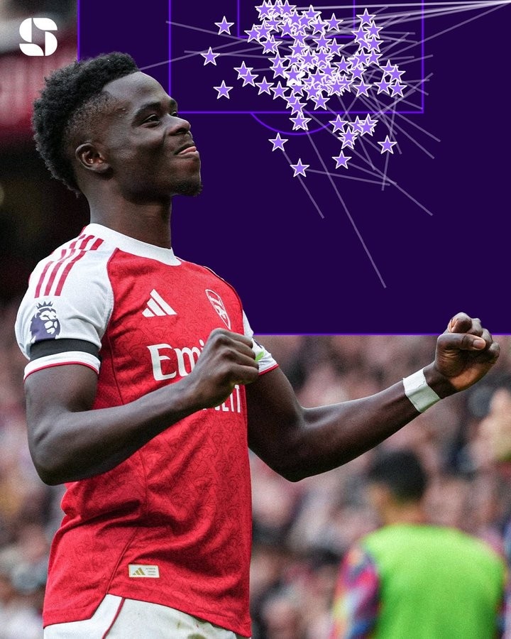 萨卡在塔帅麾下英超参与105球,创造机会+过人均300+是英超唯一