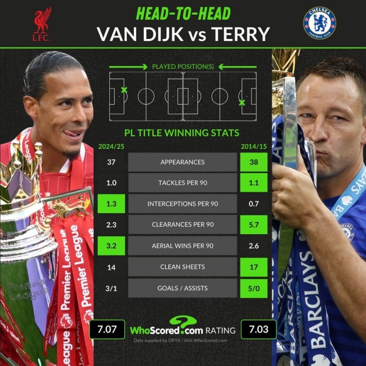 英超第一中卫?对比夺冠赛季:特里解围、零封、进球都比范戴克多