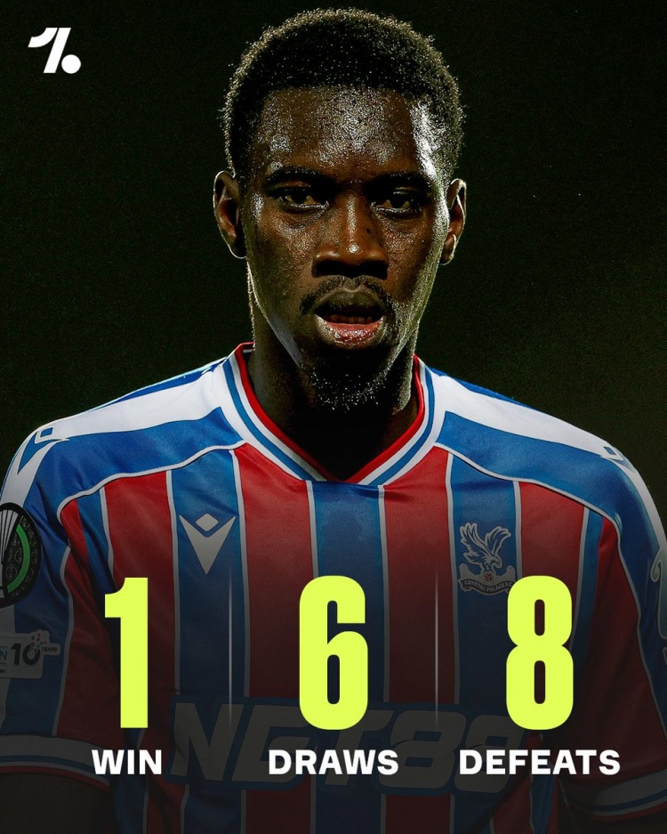 据OneFootball统计,近15场各赛事比赛,水晶宫仅取胜1场,具体战绩1胜6平8负。