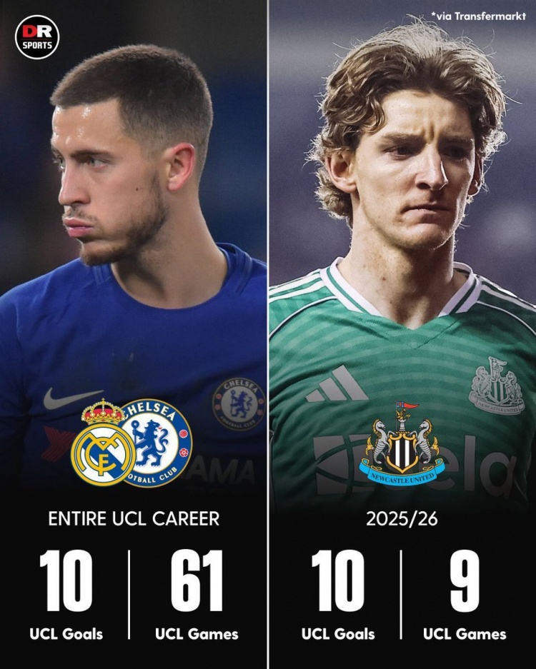 据媒体统计,戈登本赛季出战9场欧冠比赛,打进10球,已经追平阿扎尔职业生涯61场欧冠比赛的进球数量。