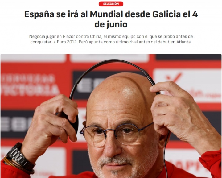 据悉,西班牙队计划于6月4日在里亚索尔球场(拉科鲁尼亚主场)与中国队进行本土最后一场热身赛,随后将飞往美洲备战美加墨世界杯,随后在世界杯举办地还将进行最后一场热身赛进行演练,对手很可能是秘鲁队。