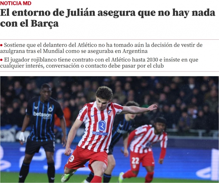 世体采访了阿尔瓦雷斯身边的消息人士,后者表示此事纯属子虚乌有,任何转会意愿都应该首先直接经过阿尔瓦雷斯的东家马竞。球员经纪人不久前也曾表示,巴萨及任何潜在追求者都未与他有过联系。