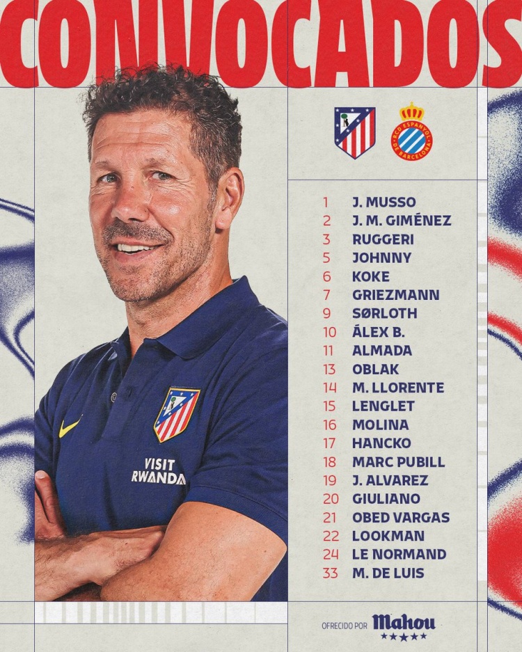 马竞对阵西班牙人名单:阿尔瓦雷斯、卢克曼、格列兹曼在列