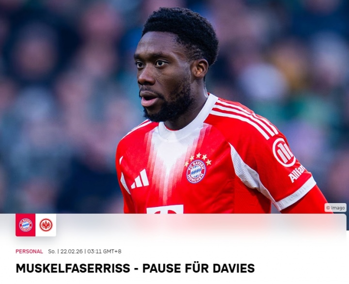 零点吧足球02月22日讯 拜仁官方通报了阿方索·戴维斯的伤情,他在本轮拜仁3-2法兰克福的比赛中因伤退场。
