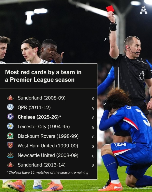 还剩11场!切尔西单季英超已吃到8张红牌,距赛事纪录只差一张