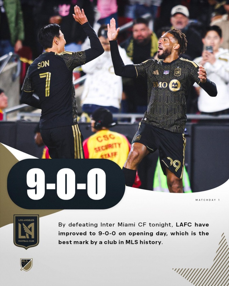- 22日 洛杉矶FC美职联首轮比赛9战全胜,创造赛事历...