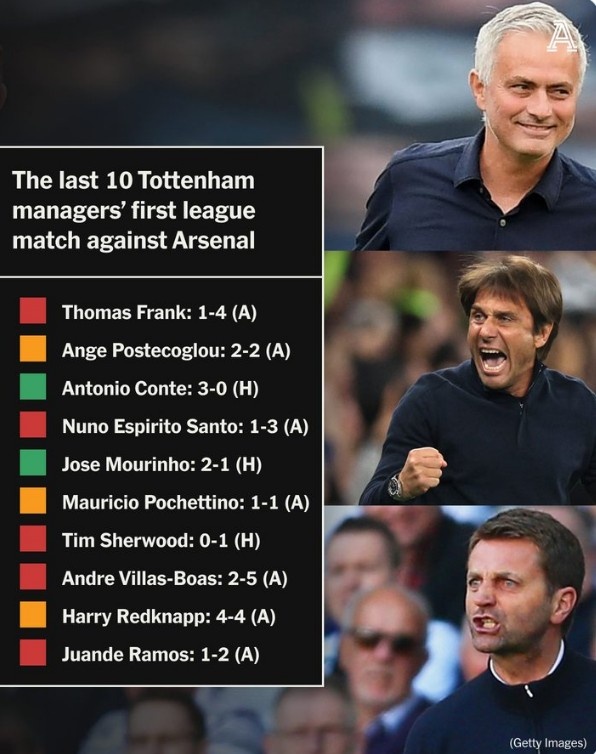 TA也盘点了热刺近10位主帅在首次面对阿森纳的战绩,具体如下: