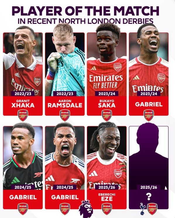 零点吧足球2月22日讯 本轮英超将迎来焦点战阿森纳vs热刺,英超官方统计,近7次英超北伦敦德比官方全场最佳球员都是阿森纳球员,具体如下: