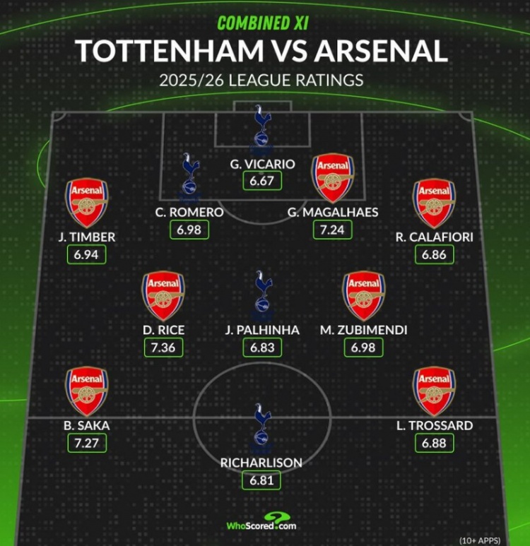零点吧足球2月22日讯 本轮英超迎来北伦敦德比大战,数据网站Whoscored也盘点了两队球员在本赛季英超场均评分最高阵容(至少10次出场):