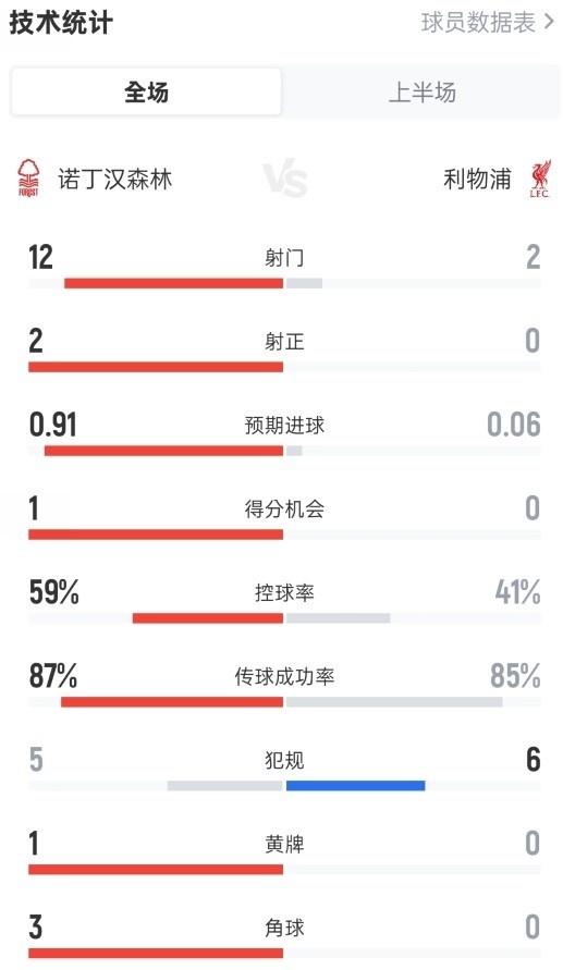 零点吧足球2月22日讯 英超第27轮,诺丁汉森林主场对战利物浦,半场两队暂时战成0-0,不过森林面对利物浦半场共射门12次,利物浦则仅有2次。