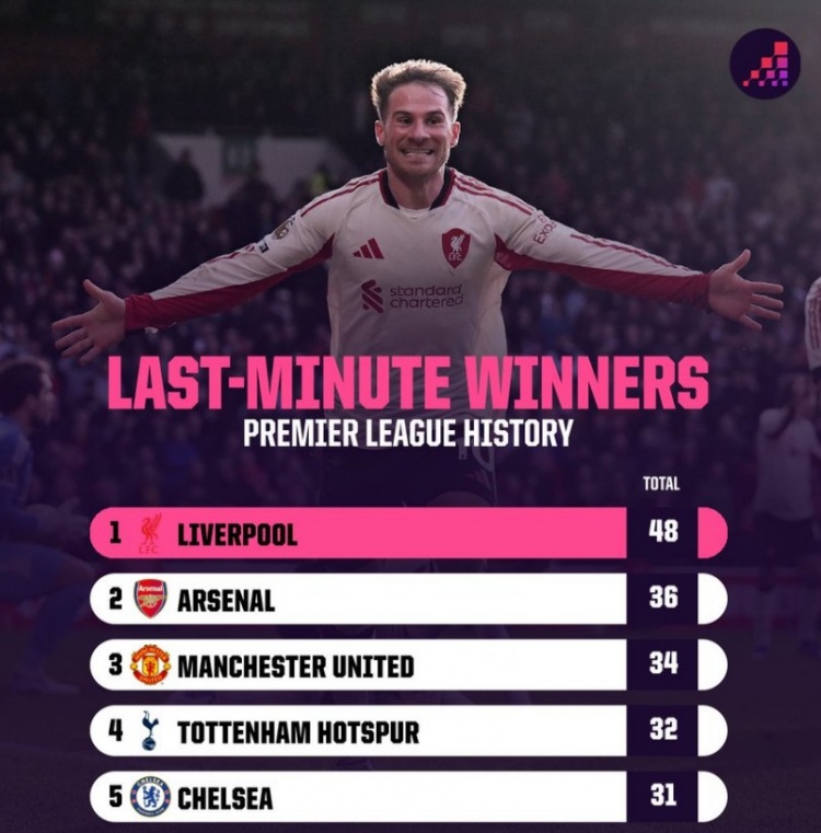 零点吧足球2月23日讯 在本轮英超,利物浦1-0险胜诺丁汉森林,麦卡利斯特打进绝杀。