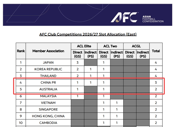 亚足联表示,此次排名榜的更新依据主要是本赛季亚冠精英联赛、亚冠二级联赛暨亚足联挑战联赛的最新战况。目前,中超4队已在亚冠精英及二级联赛中全军覆没,本赛季结束后可能被澳超反超。