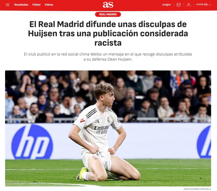 零点吧足球02月23日讯 西媒马卡报、阿斯报今日均报道了赫伊森转发辱华内容的事件,文章内容谈到皇马的微博道歉引发中国球迷不满,以及皇马在2024年就曾卷入过类似的争议。