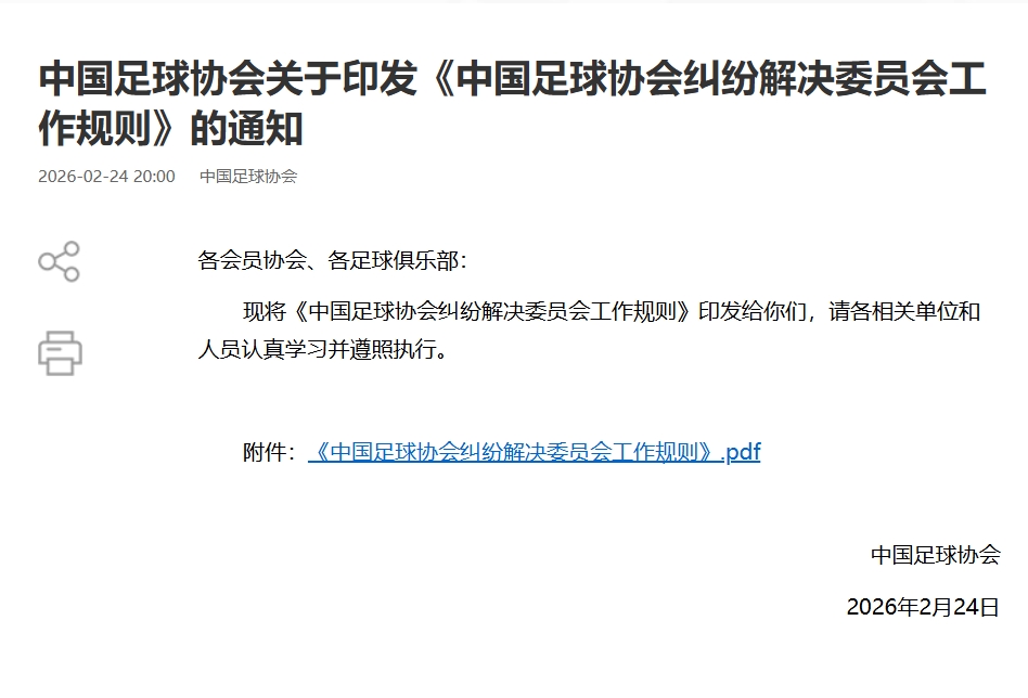 零点吧足球02月24日讯 2026年2月24日,中国足球协会印发《中国足球协会纠纷解决委员会工作规则》。