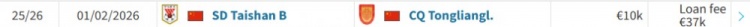 德转显示,泰山中卫岳瑞杰租借铜梁龙的费用约为30万元