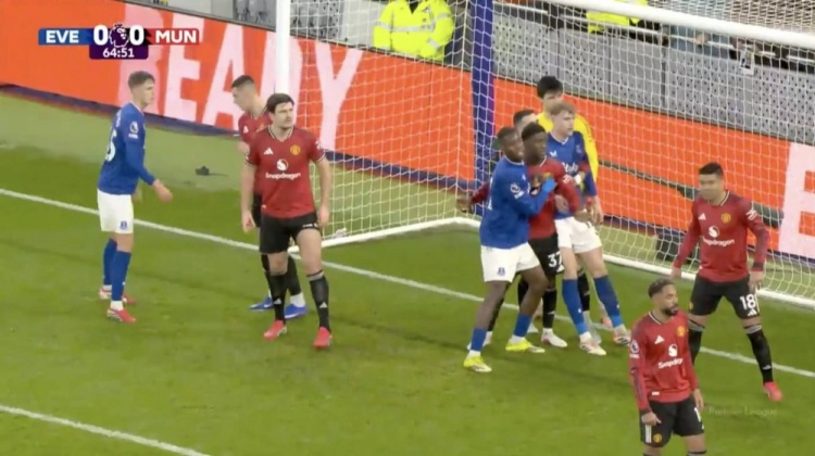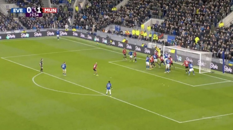 比赛第65分钟,埃弗顿派两名球员进入禁区,试图挡住拉门斯接球的路线……