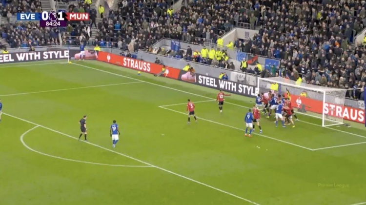 随着比赛时间流逝,埃弗顿愈发绝望,他们的战术也愈发明显。随着扳平比分的希望越来越渺茫,主队采用了一种直接、对抗性的策略——堆积禁区内人数,围堵门将,每次传中都在考验拉门斯的掌控力。