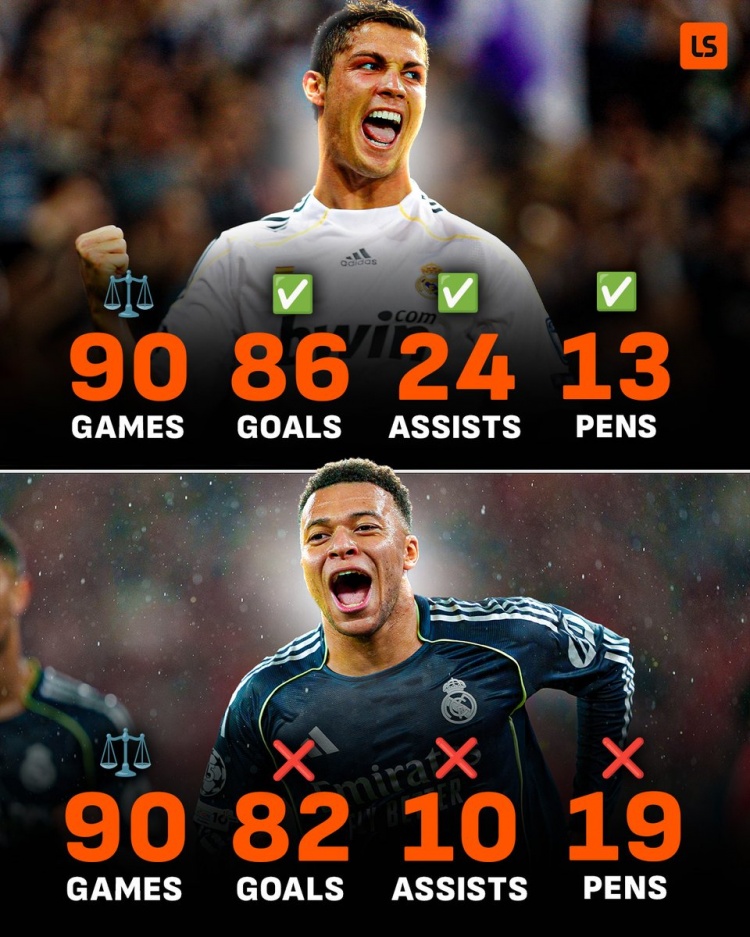 Livescore对比了C罗与姆佩巴两人加盟皇马前90场的数据:其中C罗打进84球24次助攻,主罚点球13次,而姆巴佩打进82球,贡献10助攻,罚点19次。