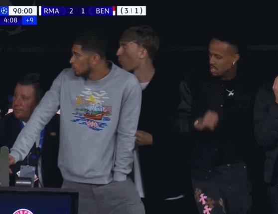补时第4分钟,镜头给到看台上的皇马多名球员。米利唐和贝林专注看比赛,赫伊森吃着什么东西。