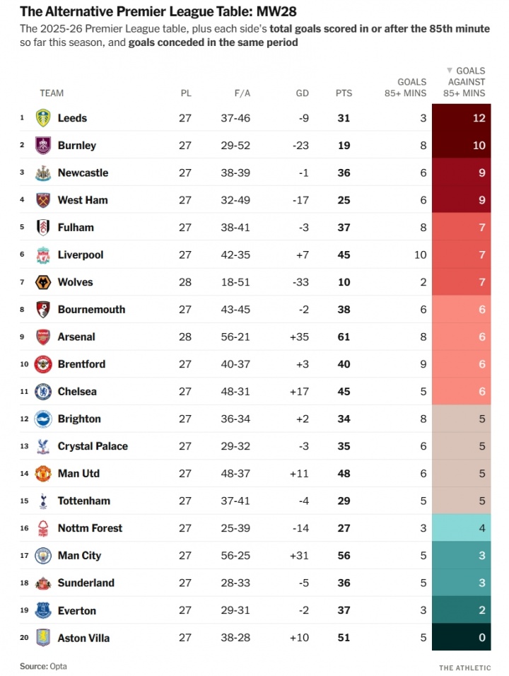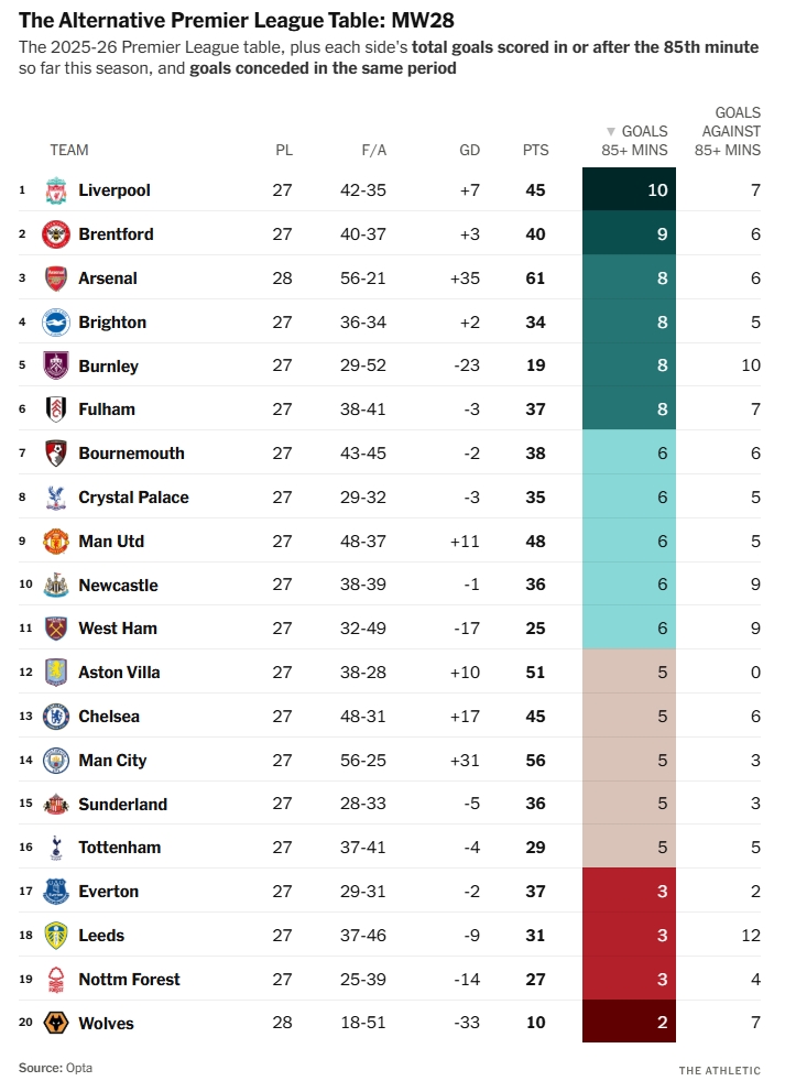 零点吧足球02月26日讯 TA统计了本赛季英超球队85分钟及以后的进球及丢球排行榜,其中利物浦以10球位列榜首,阿森纳8球位列第三。