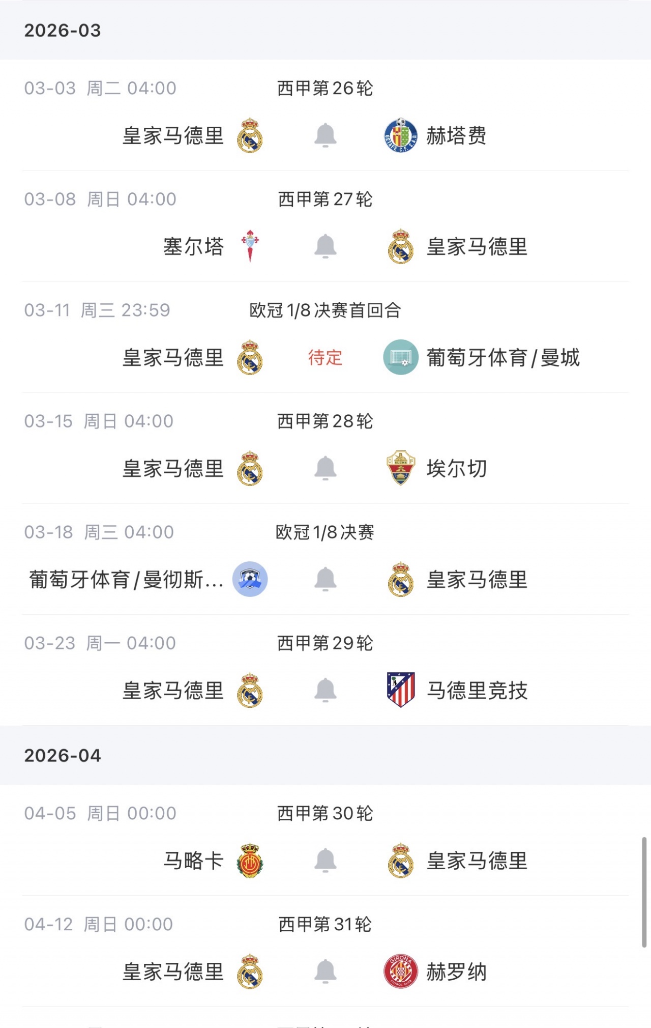 皇马将在1/8决赛中对阵葡体或者曼城,根据赛程,1/8决赛在3月10日和17日进行,1/4决赛首回合在4月7日,次回合在4月14日前后。