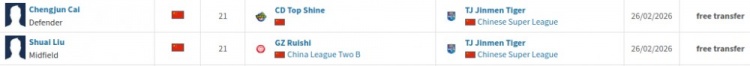 零点吧足球2月27日讯 根据德转市场显示,两名21岁年轻球员刘帅、蔡承峻加盟天津津门虎,转会方式均为自由转会。此前两人已跟随津门虎进行训练。