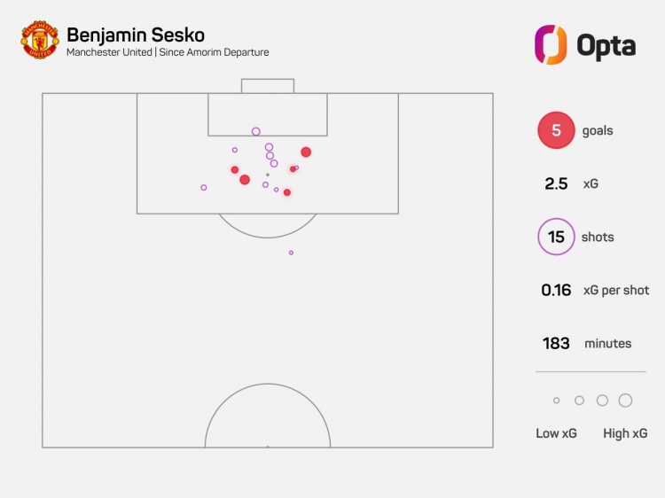据Opta统计,阿莫林离任之后,舍什科为曼联出战6场英超比赛,打进5球,平均每37分钟打进1球。